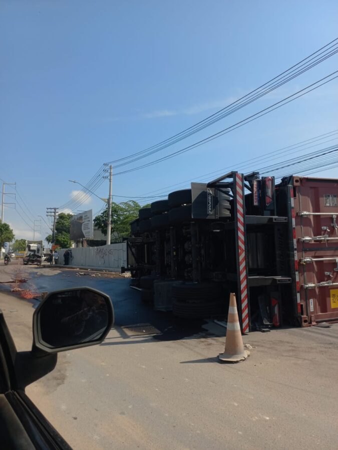 Um caminhão com contêiner tombou na manhã desta terça-feira (07/10), na Avenida Autaz Mirim, bairro do Armando Mendes, zona Leste da capital amazonense.