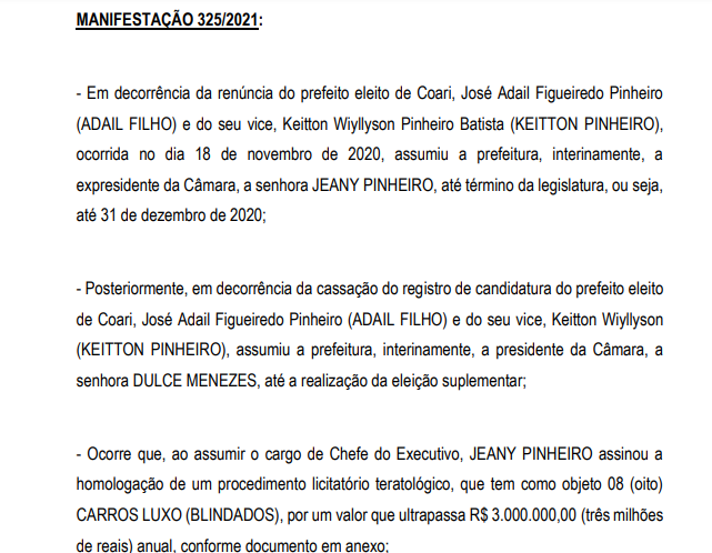 O TCE-AM deu o prazo de 15 dias para que a Prefeitura de Coari se pronuncie a respeito da manifestação realizada na Ouvidoria e justifique os atos.