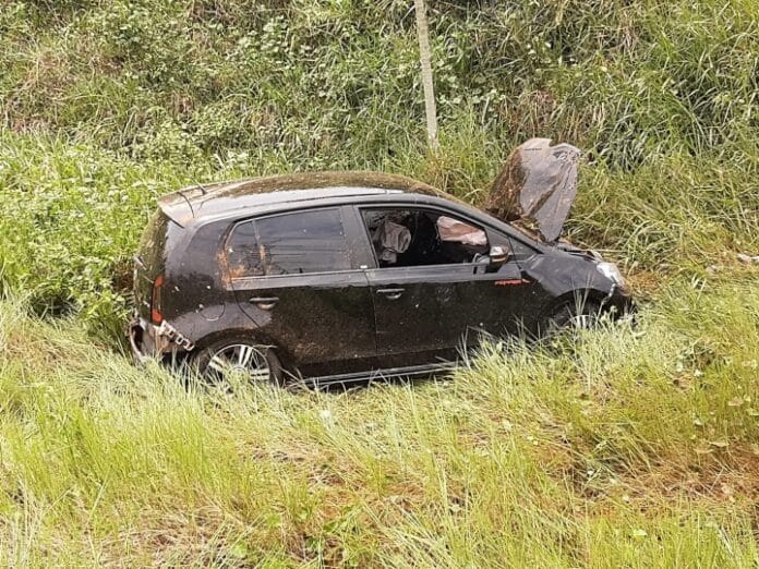 Segundo informações preliminares, o carro estaria em um racha junto com outro veículo modelo S10 e teria perdido o controle e parado em meio ao mato.