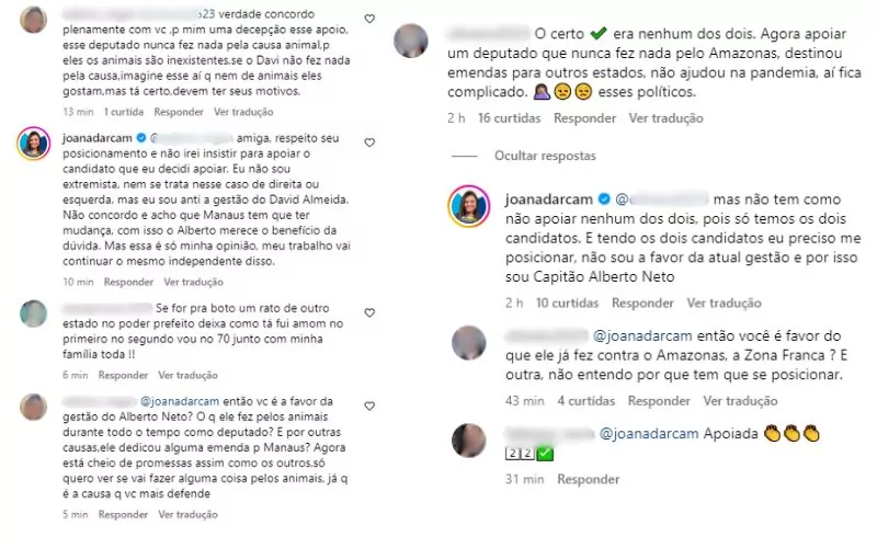 Os eleitores da deputada estadual Joana Darc e do vereador eleito Aldenor Lima expressaram descontentamento após o casal anunciar apoio ao Capitão Alberto Neto no segundo turno das eleições para Prefeitura de Manaus.