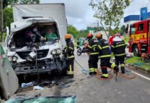 Corpo de Bombeiros resgata duas vítimas presas nas ferragens de caminhão na avenida do...
