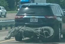 Chocante: carro com crocodilo gigantesco amarrado na traseira surpreende motoristas