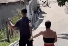Um vídeo que circula nas redes sociais mostra o momentos em que um casal anda sem sandália pelas ruas como forma de punição...
