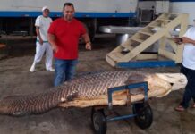 Pirarucu gigante com 2,9 metros e pesando 220 quilos é capturado por ribeirinhos em...