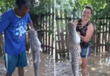 Moradora encontra peixe de 12kg no quintal após enchente no Acre