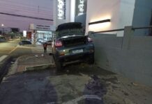 Motorista perde o controle, bate em carro estacionado e atravessa mureta