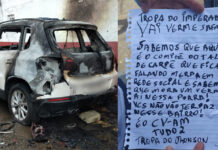 Carro de PM é incendiado e bilhete é deixado após o crime na Compensa