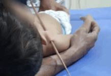 Bebê de 1 anos e 3 meses tem um espeto de churrasco atravessado no...