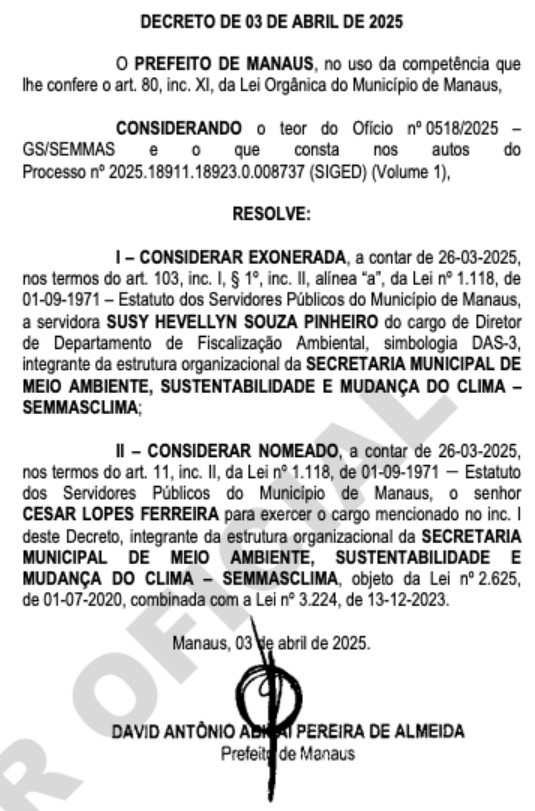 O nome de César Lopes Ferreira, foi homologado pelo prefeito no Diário Oficial do Município (DOM), nesta quinta-feira (3), e um vereador de oposição utilizou suas redes sociais para denunciar o fato a população manauara.