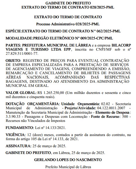 De acordo com a publicação do Diário Oficial dos Municípios (DOM), a empresa BILACORP VIAGENS E TURISMO LTDA EPP, vai receber o valor de R$ 1.265.250,00 (um milhão, duzentos e sessenta e cinco mil, duzentos e cinquenta reais), para fornecer passagens aéreas para a gestão municipal de Lábrea.
