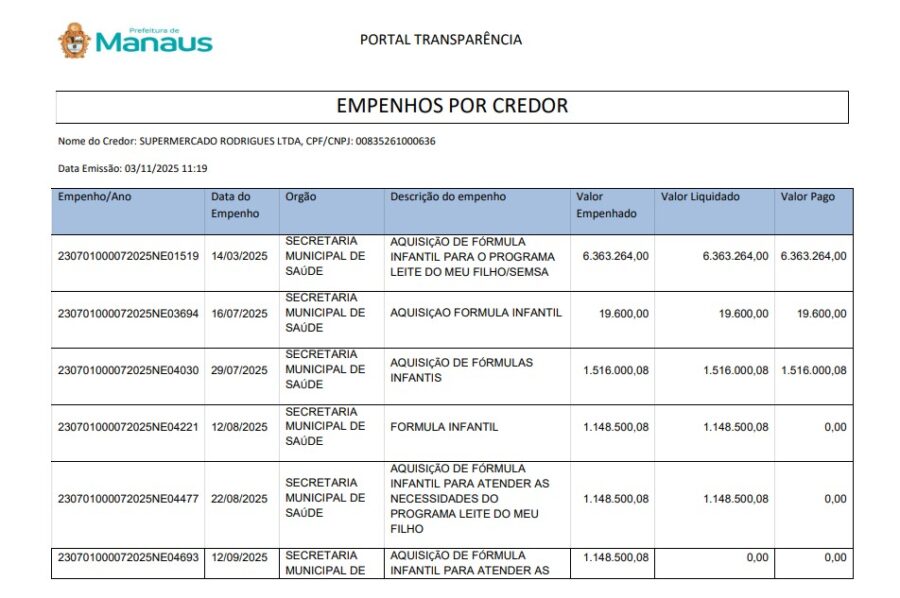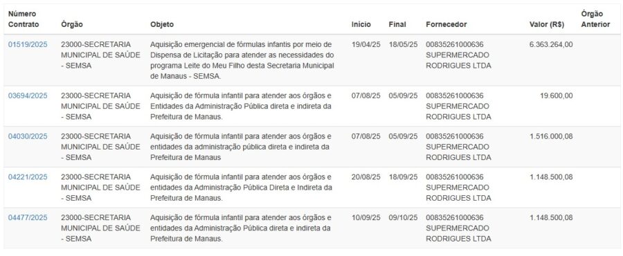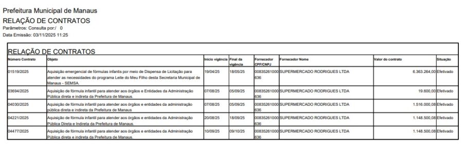 O grupo empresarial Rodrigues, já vem recebendo contratos milionários da gestão David Almeida desde 2023, quando o Supermercado Rodrigues, que faz parte desse grupo empresarial, ganhou mais de R$ 33 milhões de reais para fornecer leite para o programa “Leite do Meu Filho”, da Prefeitura de Manaus.