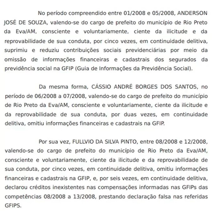 “No período compreendido entre 01/2008 e 05/2008, Anderson de Souza, valendo-se do cargo de prefeito do município de Rio Preto da Eva/AM, consciente e voluntariamente, ciente da ilicitude”, diz trecho da Ação Penal que corre na 4ª Vara Federal Criminal da Sessão Judiciária do Amazonas.