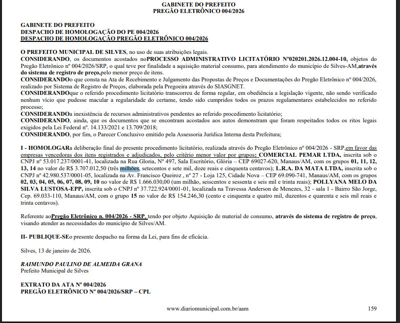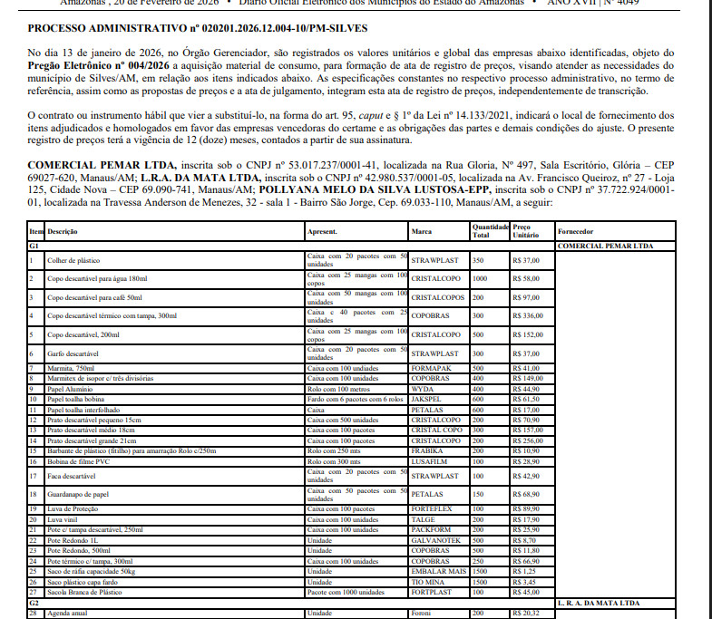 O prefeito Paulino Grana (Republicanos), vai gastar mais de R$ 5,5 milhões de compra de materiais de consumo para a Prefeitura de Silves, interior do Amazonas.