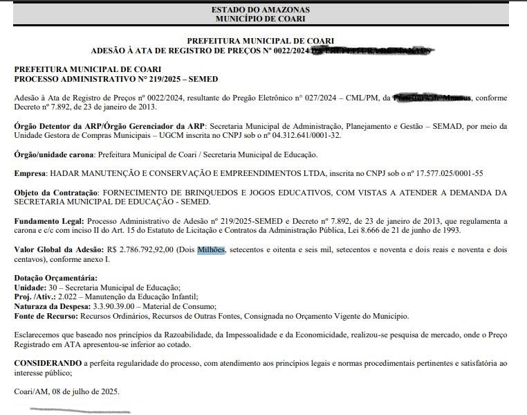 De acordo com o Diário Oficial dos Municípios (DOM), Adail vai contratar a empresa HADAR MANUTENÇÃO E CONSERVAÇÃO E EMPREENDIMENTO LTDA no valor total de R$ 2.786.792,92 (dois milhões, setecentos e oitenta e seis mil, setecentos e noventa e dois reais e noventa e dois centavos), para fornecer brinquedos e jogos educativos para a Secretaria Municipal de Educação (Semed) de Coari.