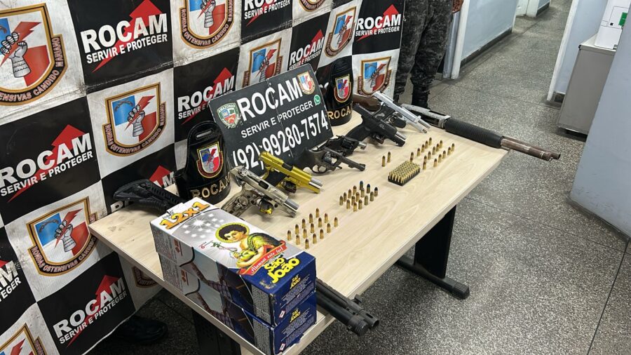 A Ronda Ostensiva Cândido Mariano (ROCAM) prendeu quatro homens e apreendeu um grande arsenal de armas de fogo na noite de quinta-feira (14/08) no bairro Novo Aleixo, zona norte de Manaus. A ação ocorreu após a polícia ser informada de um intenso confronto entre facções criminosas que estariam intimidando e expulsando moradores de suas casas.