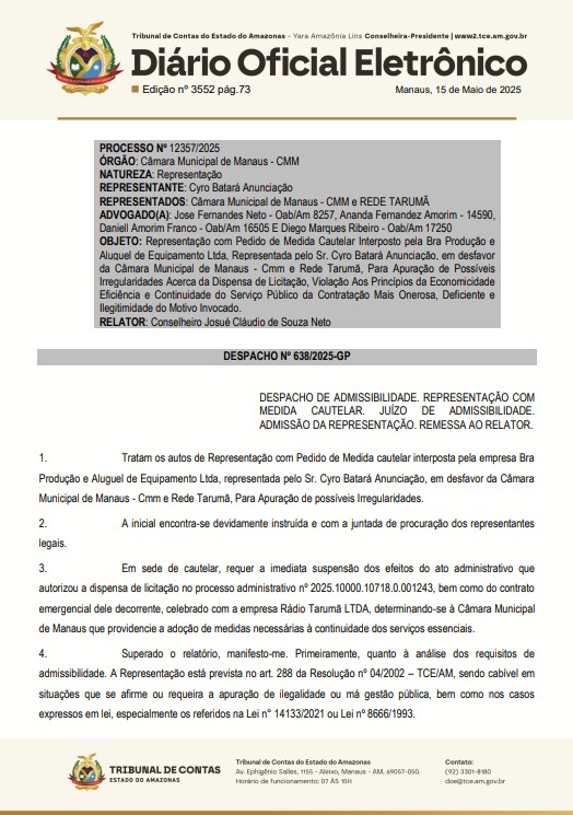 O TCE-AM vai apurar supostas irregularidades na contratação da Rede Tarumã LTDA, que pertence a família Calderaro que é dona do Grupo ACrítica, pela CMM com dispensa licitação para gastar R$ 2.775.000,00 (dois milhões, setecentos e setenta e cinco mil reais).