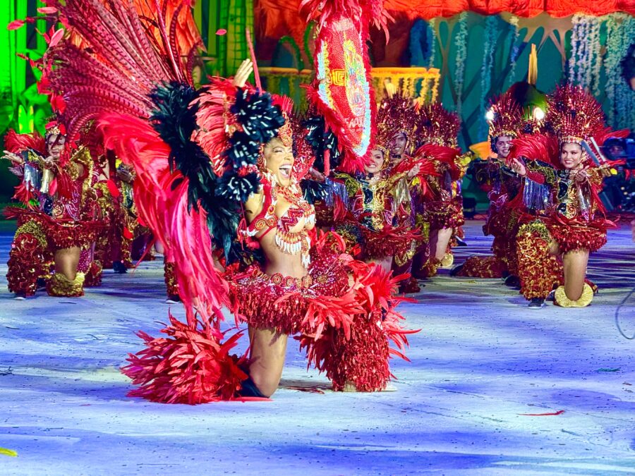 O cordão de entrada também se destacou, com brincantes caracterizados como seres aquáticos e encantados que emergiram das águas, em uma encenação inspirada na vida subaquática. A coreografia contou com um balé aéreo que deu vida ao enredo e ampliou a experiência cultural do público.