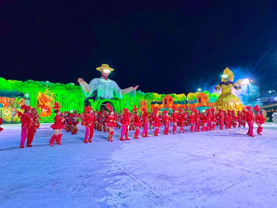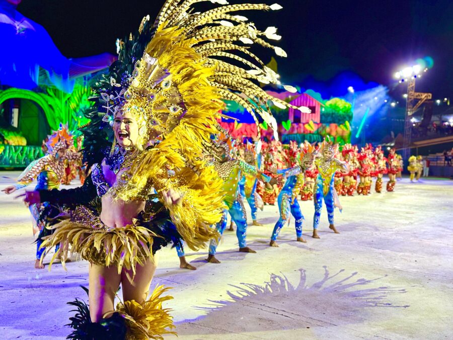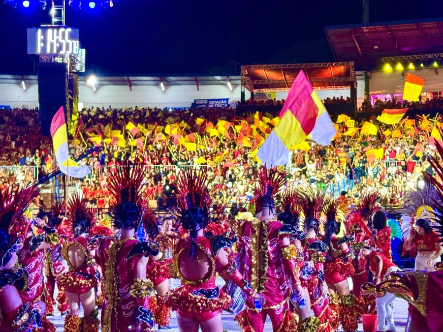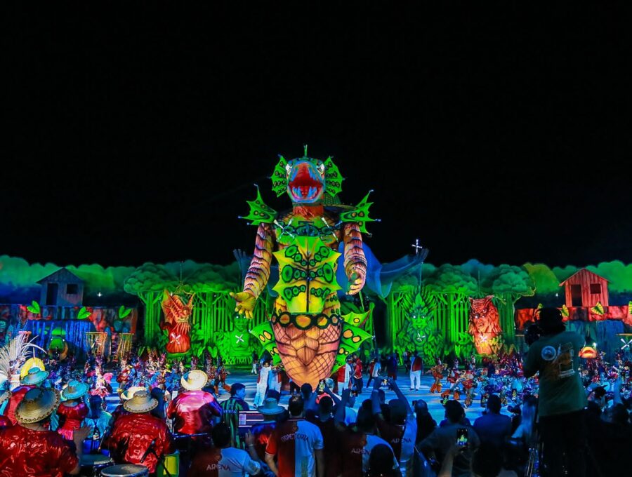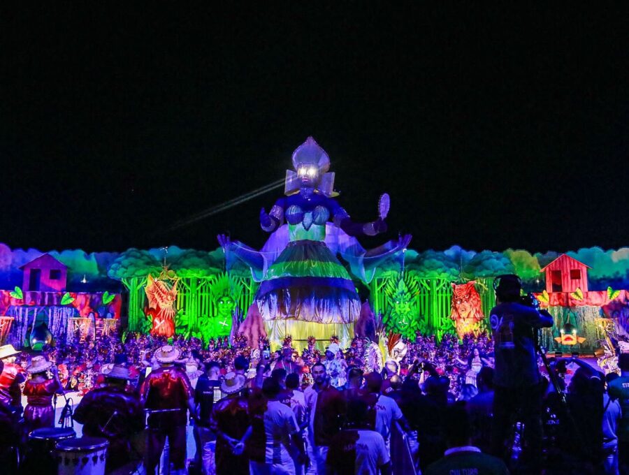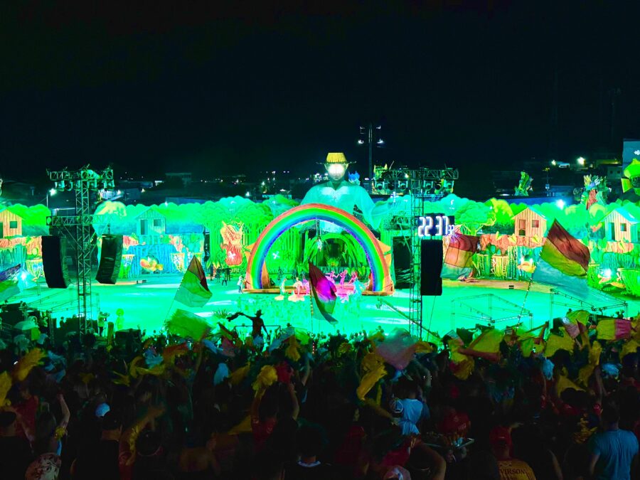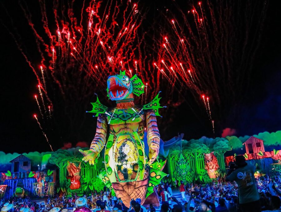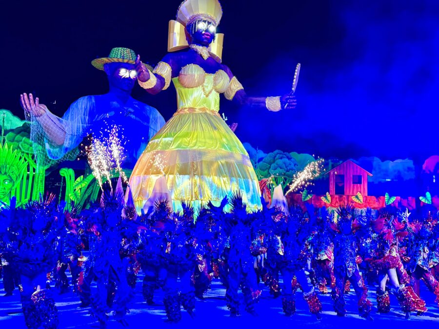 O cordão de entrada também se destacou, com brincantes caracterizados como seres aquáticos e encantados que emergiram das águas, em uma encenação inspirada na vida subaquática. A coreografia contou com um balé aéreo que deu vida ao enredo e ampliou a experiência cultural do público.