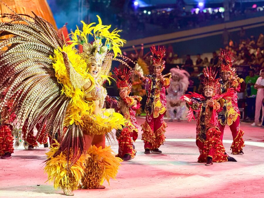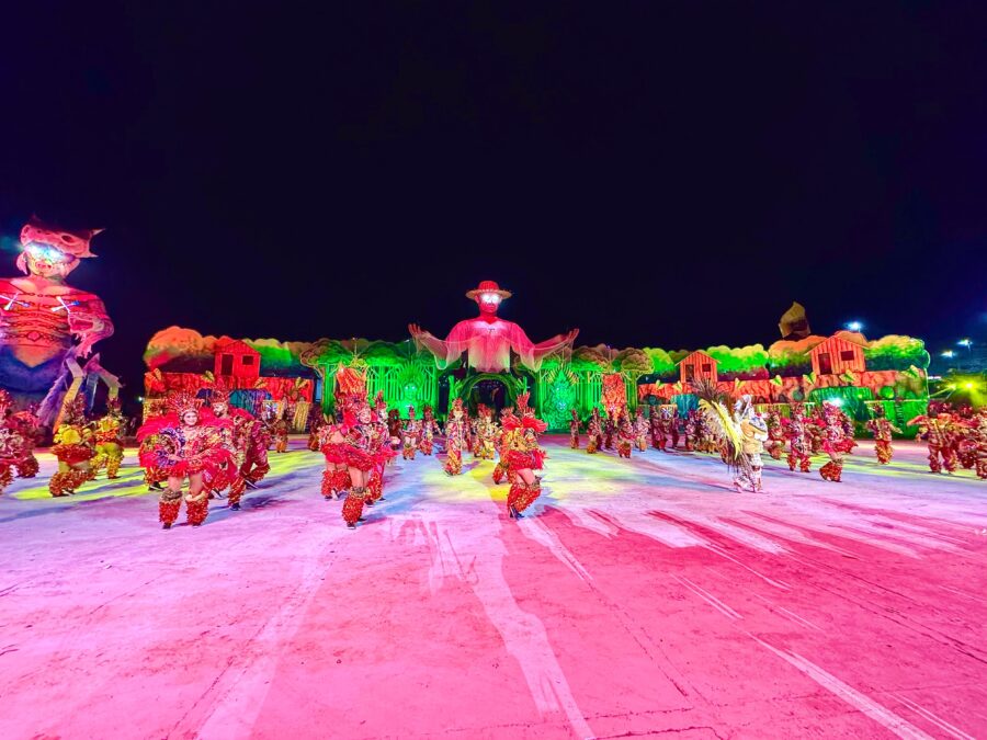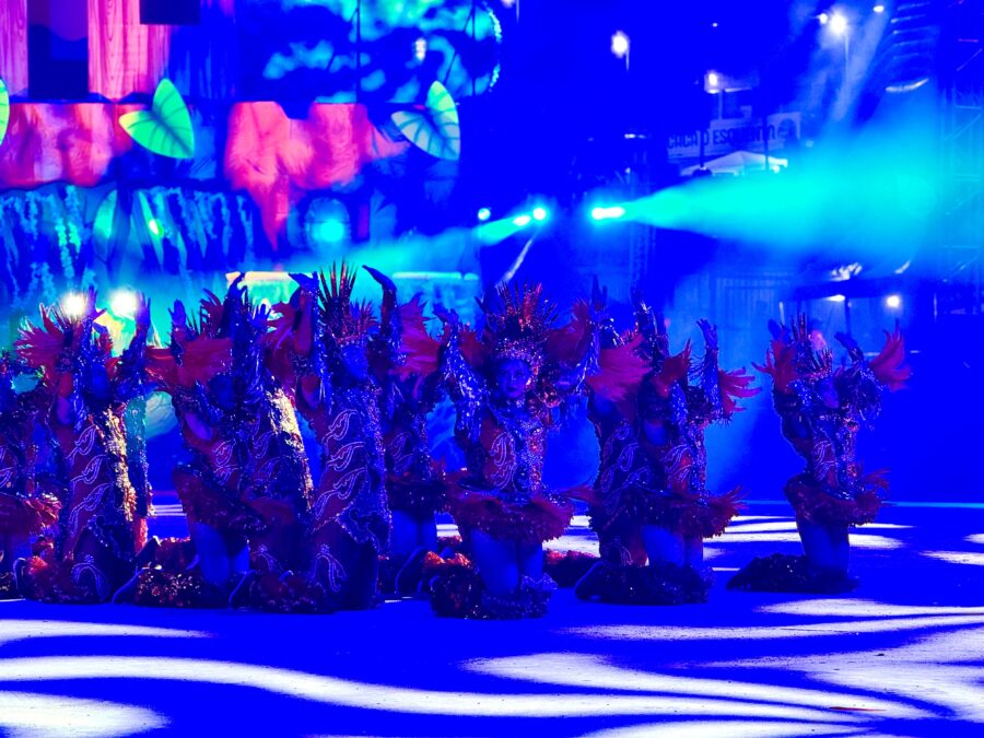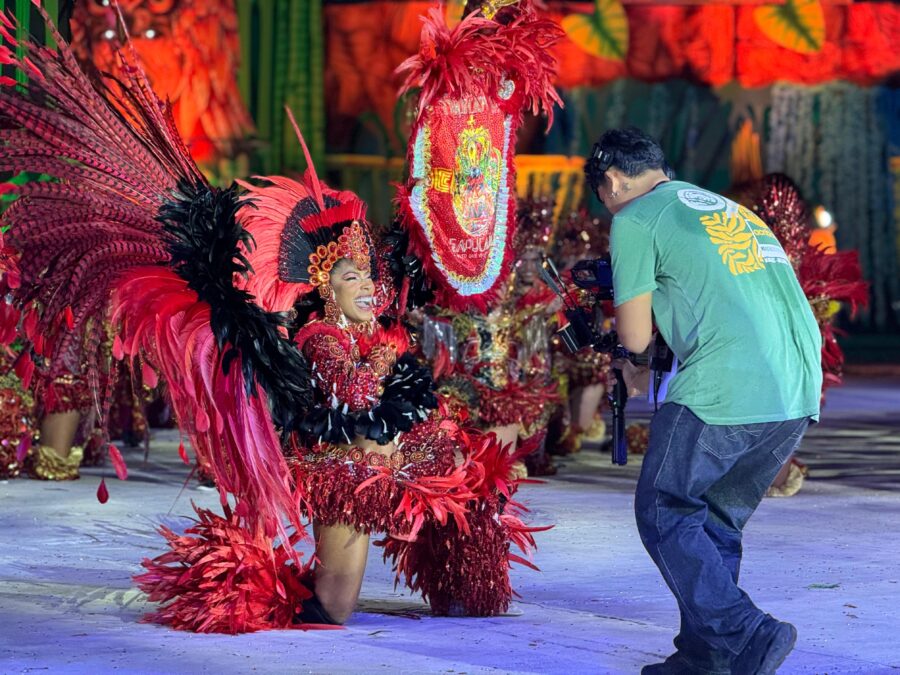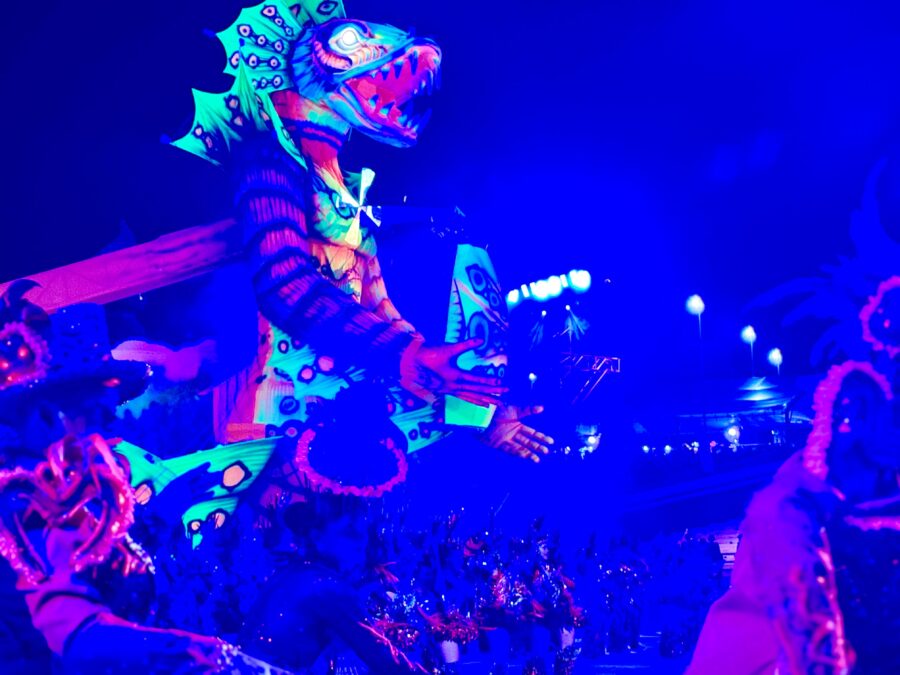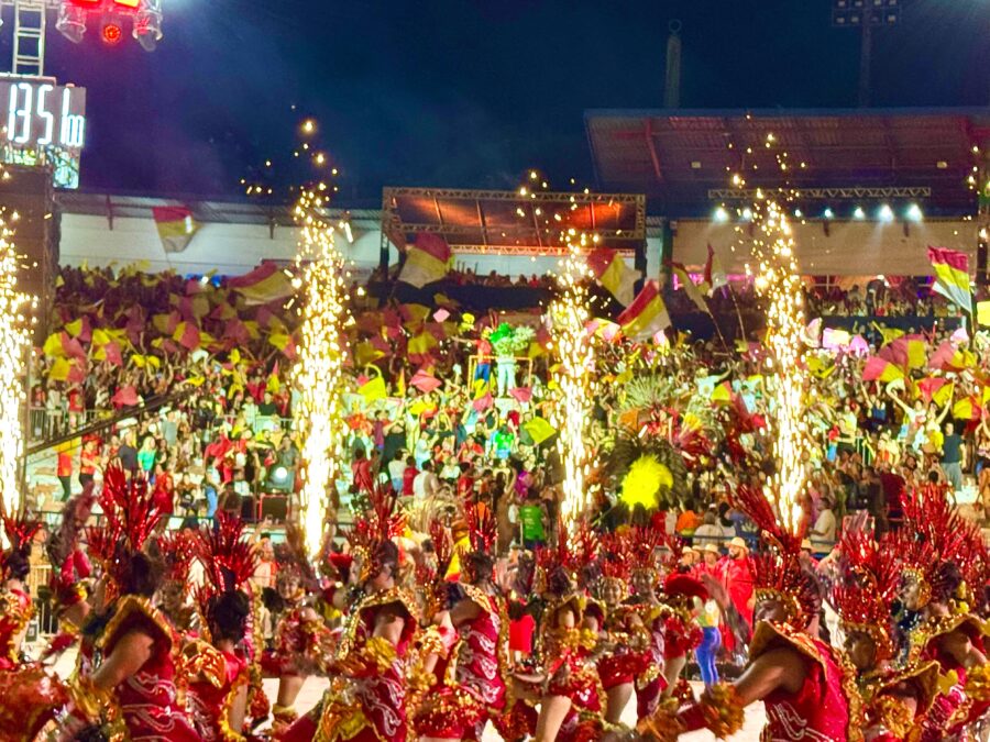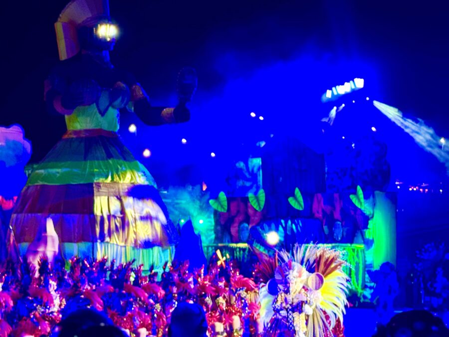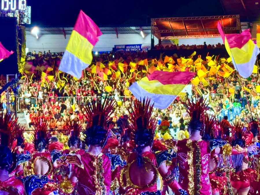 O cordão de entrada também se destacou, com brincantes caracterizados como seres aquáticos e encantados que emergiram das águas, em uma encenação inspirada na vida subaquática. A coreografia contou com um balé aéreo que deu vida ao enredo e ampliou a experiência cultural do público.