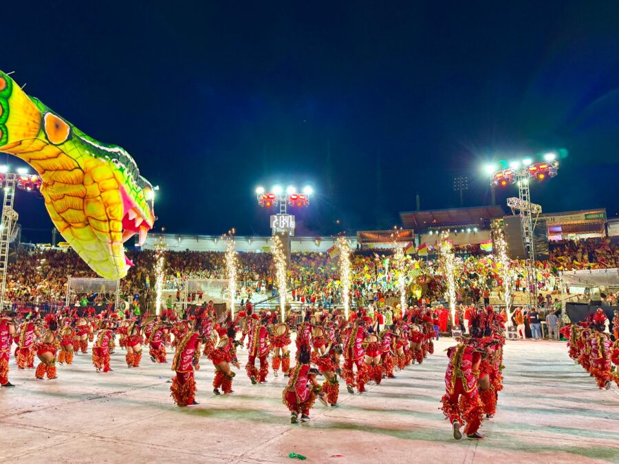 Entre as bandeiras agitadas pela Torcida Organizada Tradicional (TOT), o cordão principal surgiu do meio da arquibancada e conduzido até a arena, criando um dos momentos mais marcantes da noite e conectando torcida, personagens e espetáculo.