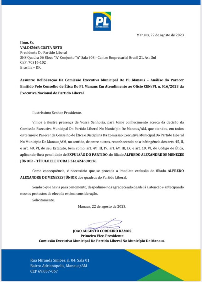 A expulsão de Menezes, que era um dos possíveis candidatos à prefeitura de Manaus nas eleições 2024, aconteceu após parecer favorável do Conselho de Ética do partido.