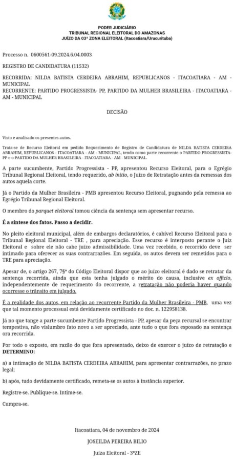 O Tribunal Regional Eleitoral do Amazonas (TRE-AM), cassou nesta segunda-feira (24) por unanimidade, a candidatura de Nilda Abrahim, que seria cunhada do prefeito Mário Abrahim (Republicanos), de Itacoatiara.
