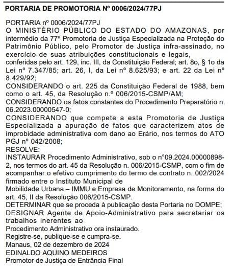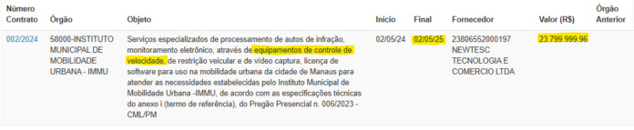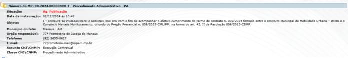 O Ministério Público do Amazonas (MP-AM), investigou possíveis irregularidades na contratação da empresa NEWTESC TECNOLOGIA E COMERCIO LTDA para “serviços especializados de processamento de autos de infração, monitoramento eletrônico, através de equipamentos de controle de velocidade, de restrição veicular e de vídeo captura, licença de software para uso na mobilidade urbana da cidade de Manaus para atender as necessidades estabelecidas pelo Instituto Municipal de Mobilidade Urbana”.