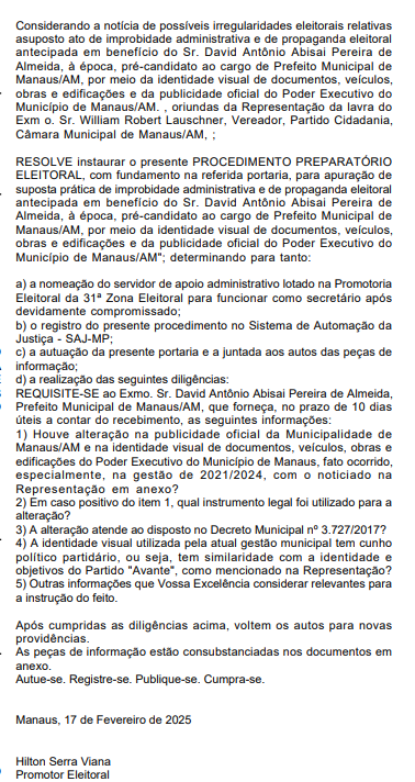 “Considerando a notícia de possíveis irregularidades eleitorais relativas asuposto ato de improbidade administrativa e de propaganda eleitoral antecipada em benefício do Sr. David Antônio Abisai Pereira de Almeida, à época, pré-candidato ao cargo de Prefeito Municipal de Manaus/AM, por meio de identidade visual de documentos, veículos, obras e edificações e da publicidade oficial do Poder Executivo do Município de Manaus/AM”, diz um trecho da denúncia.