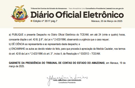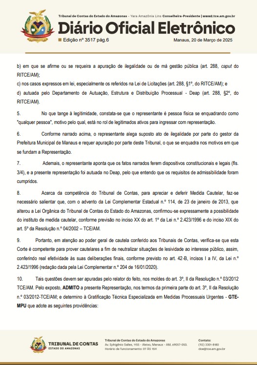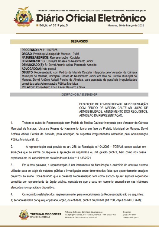 O Tribunal de Contas do Estado do Amazonas (TCE-AM), recebeu um pedido de medida cautelar para investigar o prefeito David Almeida (Avante), e a Prefeitura de Manaus por supostas irregularidades na gestão pública municipal.