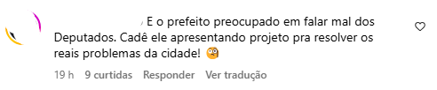 “E o prefeito preocupado em falar mal dos Deputados. Cadê ele apresentando projeto pra resolver os reais problemas da cidade?”, questionou uma internauta.