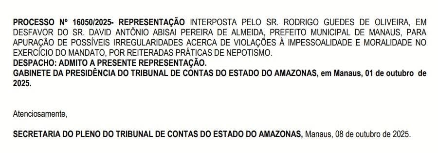 O Tribunal de Contas do Estado do Amazonas (TCE-AM), acatou um pedido de Representação com Medida Cautelar, contra o prefeito de Manaus David Almeida (Avante), por suspeitas de prática de nepotismo e favorecimento a familiares em contratações feitas pela Prefeitura de Manaus.