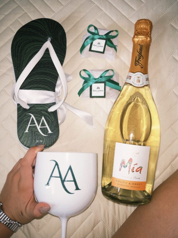 Além do espumante, Fernanda Aryel ainda distribuiu kits de lembrancinhas com sandálias e copos personalizados.
