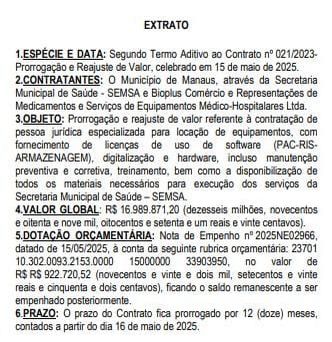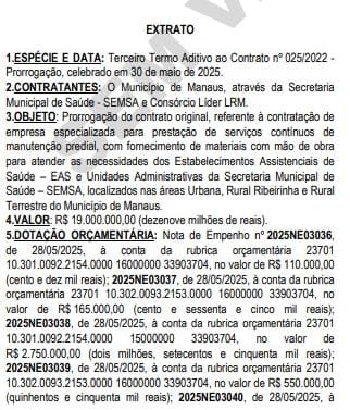 De acordo com o Diário Oficial do Município (DOM), a Prefeitura de Manaus e Semsa, contratou duas empresas sendo a primeira empresa a CONSÓRCIO LÍDER LRM, pelo valor total de R$ 19 milhões de reais para fornecimento de mão de obra para atender a Semsa.