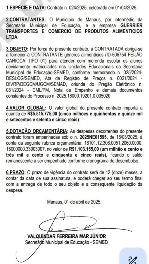 De acordo com o Diário Oficial do Município da última quarta-feira (7), a Prefeitura de Manaus por meio da Semed, contratou a empresa GUERRIER TRANSPORTES E COMÉRCIO DE PRODUTOS ALIMENTÍCIOS LTDA, no valor total de R$ 5.515.775,00 (cinco milhões, quinhentos e quinze mil, setecentos e setenta e cinco reais), para fornecer feijão.