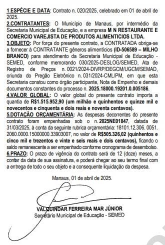 David Almeida (Avante) deve gastar quase R$ 3 milhões de reais em produtos alimentícios, como polpa de cupuaçu e milho branco, para atender a Secretaria Municipal de Educação (Semsa), em dois contratos distintos.
