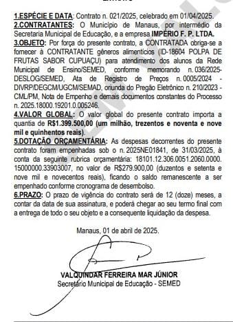 David Almeida (Avante) deve gastar quase R$ 3 milhões de reais em produtos alimentícios, como polpa de cupuaçu e milho branco, para atender a Secretaria Municipal de Educação (Semsa), em dois contratos distintos.
