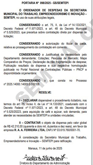 De acordo com o Diário Oficial do Município (DOM), a empresa R.A.A. FERREIRA LTDA, de nome fantasia Delícias do Norte, vai receber o total de R$ 42.210,00 (quarenta e dois mil, duzentos e dez reais), por café e açúcar.