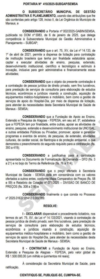 De acordo com a publicação no Diário Oficial do Município (DOM), o prefeito David Almeida (Avante), vai gastar R$ 1,5 milhão com dispensa de licitação para contratar a empresa FUNDAÇÃO DE APOIO AO ENSINO, EXTENSÃO E PESQUISA DE ALAGOAS (FEPESA), para elaboração de “estudos técnicos, econômicos e jurídicos” para a criação do futuro Hospital-Dia em Manaus.