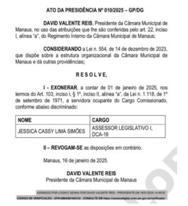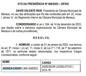 Jéssica Cassy já tinha um cargo na Câmara Municipal de Manaus nos últimos anos, mas com essa “nova função”, teria um salário maior pago pelo município.