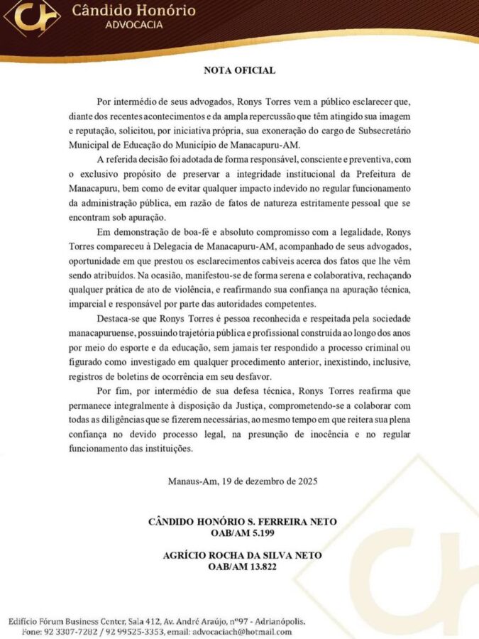 Ronys Torres divulgou por meio das redes sociais e seu escritório de advocia, uma nota em que afirma, que deixou a função na Prefeitura de Manacapuru, como uma demonstração de boa-fé e absoluto compromisso com a legalidade.