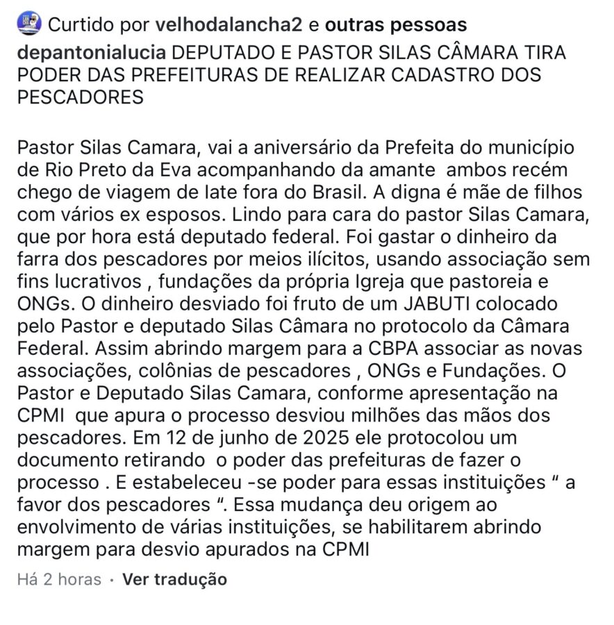 Em uma publicação nesta terça-feira (27/01), Antônia Lúcia afirmou que Silas Câmara teria participado do esquema que envolve a utilização de associações, colônia de pescadores, fundações e ONGs para movimentar recursos de forma irregular.