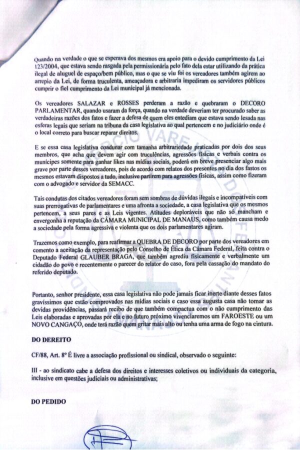 “Está claro que é uma perseguição política. Estão incomodados com o trabalho desenvolvido pelos vereadores, e eles convocam uma pessoa liga diretamente a prefeitura de Manaus para representar contra os dois vereadores. Quem é essa pessoa? um criminoso que já foi preso em 2019 por extorsão. Ano passado apareceu em vídeo amplamente divulgado agredindo uma pessoa na feira”, disse Péricles em vídeo.