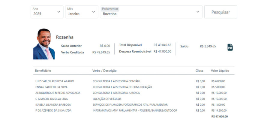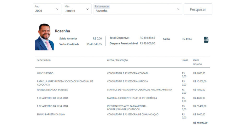 Nos primeiros três meses deste ano de 2026, o parlamentar já gastou R$ 148.580,00 (cento e quarenta e oito mil, quinhentos e cinquenta e oito reais).