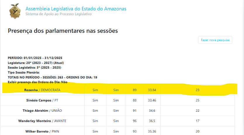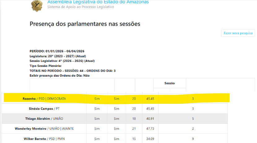 Apontado como uma das opções para a eleição de governador tampão em 2026, que ocorrerá na Assembleia Legislativa do Amazonas (Aleam), o deputado estadual Rozenha (PSD), está entre os parlamentares mais faltosos da casa legislativa estadual.