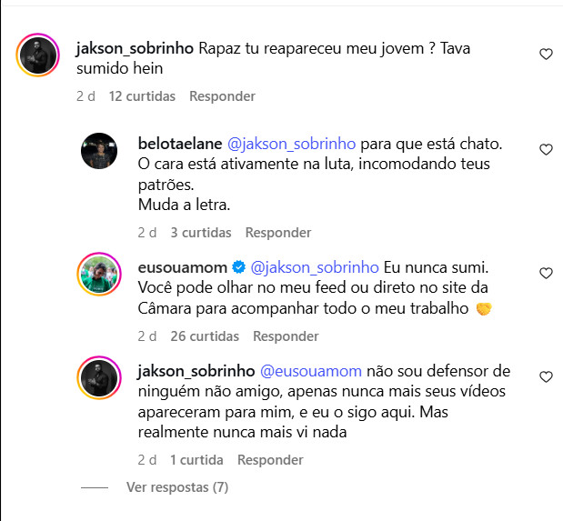 “Rapaz tu reapareceu meu jovem ? Tava sumido hein”, questionou o seguidor.