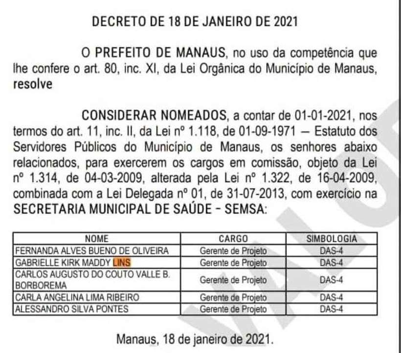 As irmãs, que agora estão vacinadas, não pertencem ao grupo de risco da doença e foram nomeadas horas antes de a imunização ser iniciada em Manaus. É o que aponta o Diário Oficial do Município (DOM).