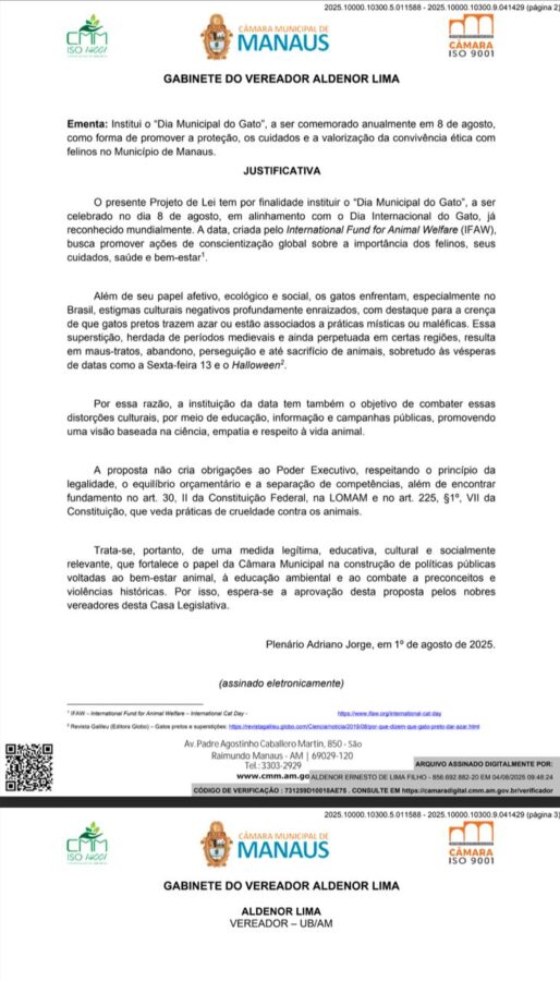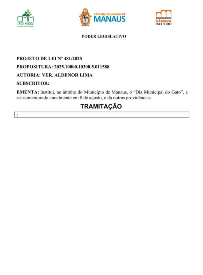 Manaus- Buracos nas ruas, lixo acumulado, violência crescente e transporte público precário. Em meio a esse cenário de problemas que afetam diariamente a vida da população, a Câmara Municipal de Manaus (CMM) recebeu mais um projeto de lei sem impacto direto nas urgências da cidade: a criação do “Dia Municipal do Gato”, proposta apresentada pelo vereador Aldenor Lima (União Brasil).