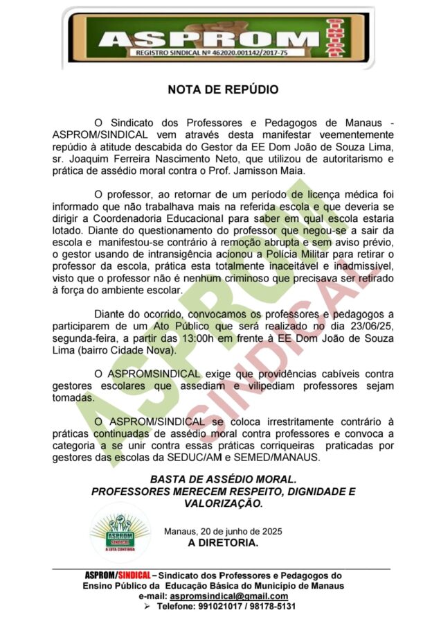 De acordo com informações repassadas pelo Sindicato dos Professores e Pedagogos de Manaus (ASPROM/SINDICAL), o diretor da Escola Estadual Dom João de Souza Lima, Joaquim Ferreira Nascimento Neto, chamou a Polícia para expulsar o professor Jamisson Maia do local.