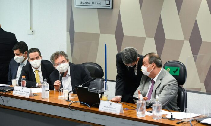 Comissão Parlamentar de Inquérito da Pandemia (CPIPANDEMIA) realiza oitiva do sócio-proprietário da Precisa Medicamentos. A empresa representou no Brasil o laboratório indiano Baraht Biotech, que fabrica a vacina Covaxin, e estaria envolvida em irregularidades no processo de compras do imunizante pelo Ministério da Saúde.  Mesa: advogado Pedro Ivo Velloso; advogado Ticiano Figueiredo; sócio-proprietário da Precisa Medicamentos, Francisco Emerson Maximiano; vice-presidente da CPIPANDEMIA, senador Randolfe Rodrigues (Rede-AP); presidente da CPIPANDEMIA, senador Omar Aziz (PSD-AM). Foto: Jefferson Rudy/Agência Senado