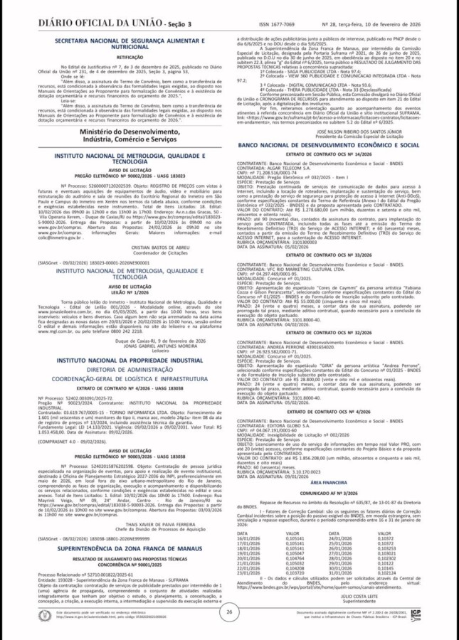A edição do Diário Oficial da União do dia (10 de fevereiro de 2026) escancarou uma série de atos administrativos que envolvem contratos milionários, licitações estratégicas e disputas sensíveis, com impacto direto em órgãos federais e na gestão de recursos públicos .